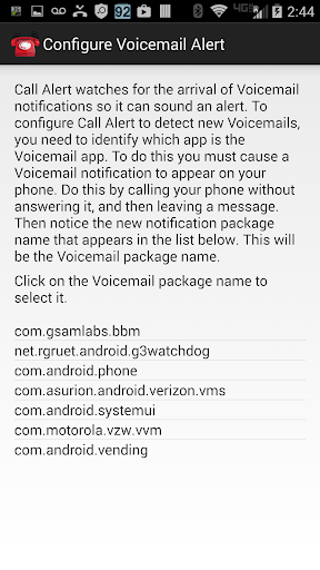 To set up Call Alert, you will be prompted to allow Call Alert to view notifications. This lets the app detect when a new voice mail or SMS message arrives. Next you will be asked to identify the phone app, voicemail app and messaging app used on your phone. Follow the instructions shown on how to do this.