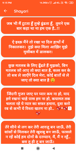 Then you are in right place. Just download it and get largest collection of Shayari. here, you can share any shayari for free within a few seconds. Once downloaded, you can share your favorite shayari to your girl friend, boy friend, friends and family via Facebook, WhatsApp, and Instagram.