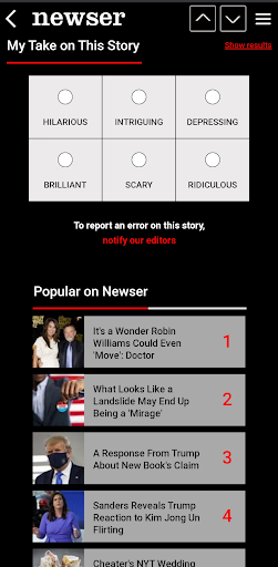 Newser's editors present the day’s most essential, entertaining, and quirky news in stories that are typically two paragraphs long, giving you a quick way to know what’s going on in the world, especially on the go. Our sharply written stories pack in only the most interesting details—none of the boring stuff—and we're pretty to look at, too. Our signature grid, reformatted for Android phones, lets eye-catching photos and short and snappy headlines do the talking, providing a vivid snapshot of the day's news.