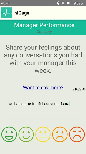 Is connecting with millennials and superstars a challenge? What if you had the power to influence how people feel about your workplace at your fingertips? n!Gage (product) measures the moods of the organization and potential mood impacts of actions with real-time actionable people insights. Business leaders now can LISTEN, UNDERSTAND, and ACT using simple, anonymous mood feedback mechanisms.