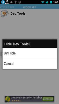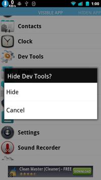 Hide App Free can hide any app. After the app is hided, the app icon will disappear from the Launcher. If you want to use app again, you have to "UnHide" app.