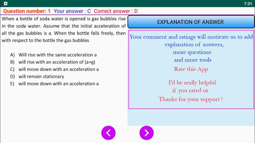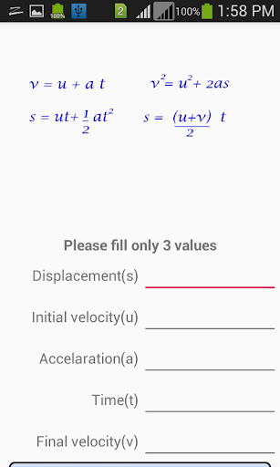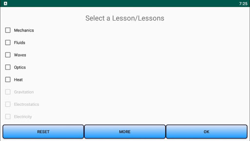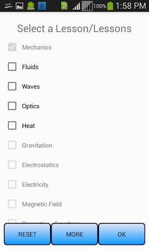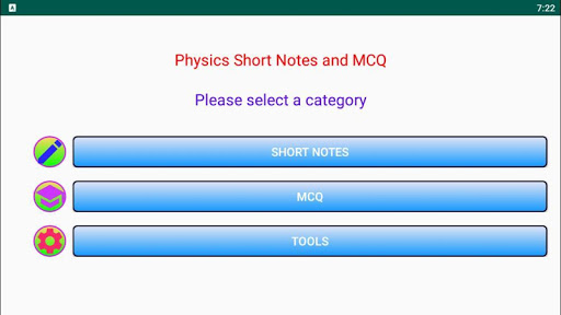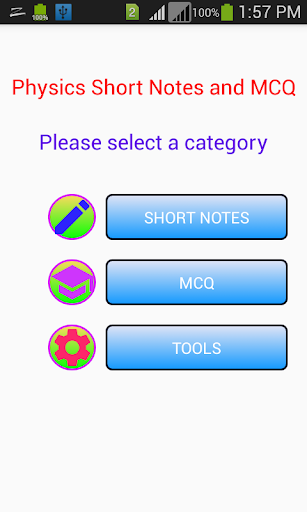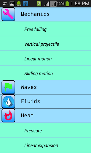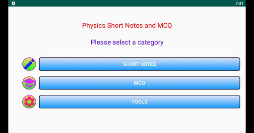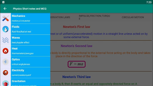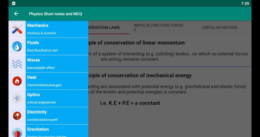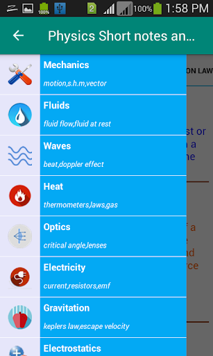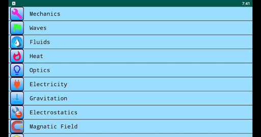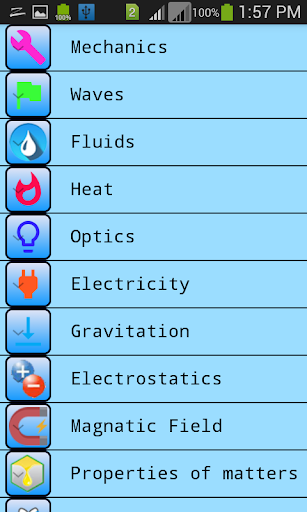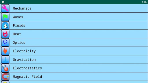 This app contains following topics Mechanics Fluids Waves Heat Optics Electricity Gravitation Electrostatics Magnetic Field Properties of matters Modern Physics Electronics Constants