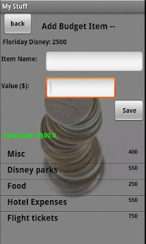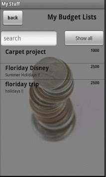 Key in a budget name, Budget $ amount, a desc and save. Tapping the menu button presents the saved Budget list. Long tapping a saved budget allows you to delete a saved budget. Single tapping a saved budget takes the user to the budget line screen. The budget line screen allows the user to add line numbers to the budget.