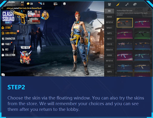 As for how to use this application, it's very easy. First, make sure you have downloaded all the resources through the cloud icon in the Free Fire game. Then download this app and click on the downloaded file to install it. After, open this application and launch the game via the button at the top of the home page. Then click on the floating window and you can select the skins you want to wear. You can also choose the crosshair according to your need. Afterwards, let's go to launch the game with the most beautiful skin!