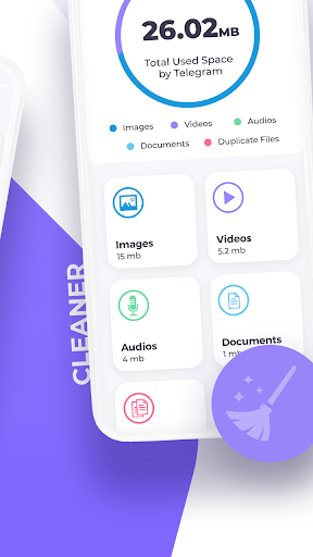 Cleaner - You can clean all the junk files including media files, documents sent and received on Telegram to make more space in your phone.