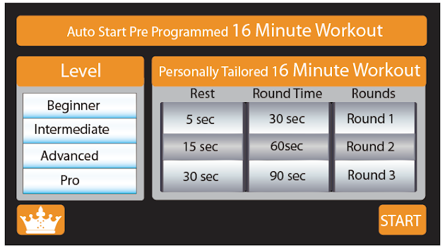 PUNCHBOXFIT also allows for pre-programming a training session, recording the results and being able to access that information at the end of the training session. PUNCHBOXFIT can be programmed to go for up to 20 rounds from thirty seconds to five minutes in duration. With 10 up to 60 second rest periods in between each round.