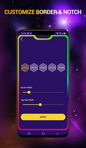 Night Border Light is a live wallpaper that shows a slowly moving colorful border around your screen's edges. It can be adjusted to fit any screen, whether there is a gap or not, you can manage these settings by opening the app and changing the screen shape settings.