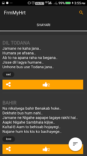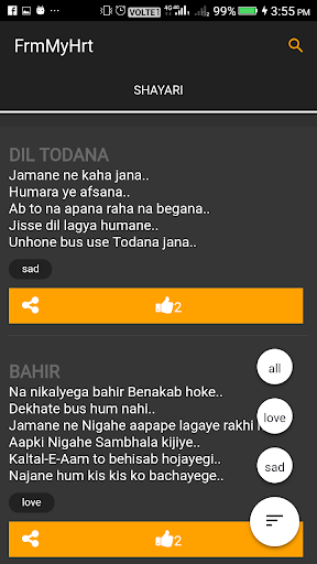 Romantic love shayari poems have the power to take one towards his/her lover or loved ones. Express your innermost romantic feelings with the best romantic shayaris for android phones. And the most important fact is to write sher or shayari you need a lot of imagination and it is dificult for everyone. To give the power of words and emotions to your android phone we are coming with frmmyhrt.