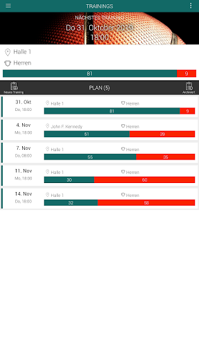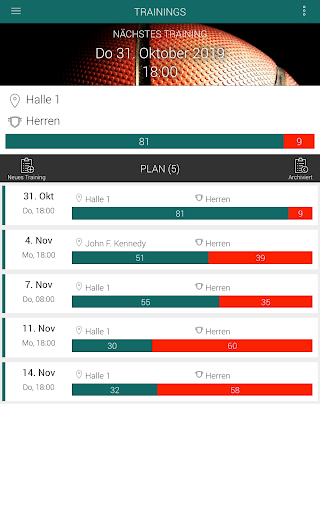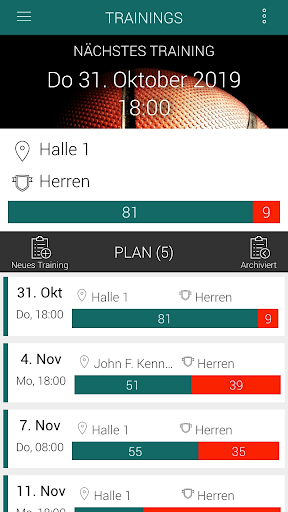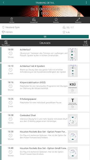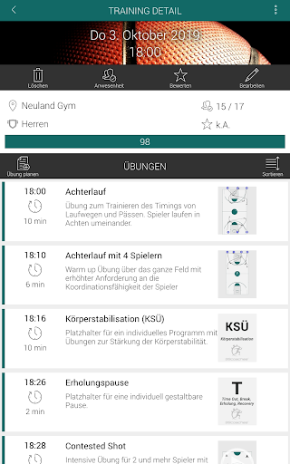 Mit wenigen Klicks planst du deine nächsten Trainings. Einfach einen Termin anlegen und den Trainingsplan mit fertigen Basketballübungen aus unserer Datenbank oder deinen eigenen gespeicherten Übungen befüllen. Fertig! In der Trainingsübersicht zeigt dir 99coaches automatisch wie viel Zeit du von deinem Training schon verplant hast. So siehst du alle deine Trainings und ihren Status auf einen Blick.