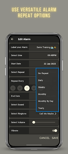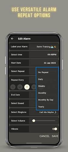 🔸 Use versatile smart alarm repeat options which are not commonly found in other Apps! See how it can help with drink water friendly reminders?