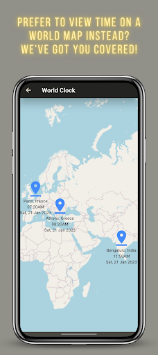 🔸 View digital clocks on a world map for all the different cities you have added!