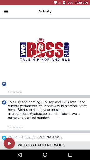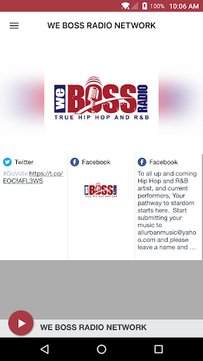 Internet station that plays "True Hip Hop and R&B This application is the official, exclusive application for WE BOSS RADIO NETWORK under an agreement between WE BOSS RADIO NETWORK and Nobex Technologies.