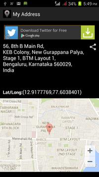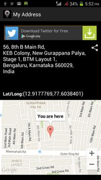 This app provides current address as well as postal code of your current location. If you are moving in train, car or bus and you wanted to know where you are you can just open this app and it will display your current location and postal code. It provides you an option to share your address with other applications like Message, Whatsapp etc. You can see your location on map also.