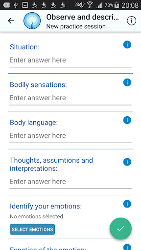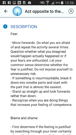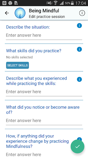 The app contains detailed descriptions, practice tips and rationale based on the skills used in Dialectical Behavior Therapy, which has proven to be very effective in helping people with various difficulties – in particular due to its focus on learning effective skills. The skills are divided into six modules: Mindfulness, Interpersonal Skills, Emotion Regulation, Distress Tolerance, Validation, and Problem Solving. The app’s functions are designed to strengthen learning of and increase accessibility to the skills, thereby assisting the development of effective behaviors.