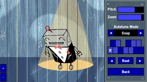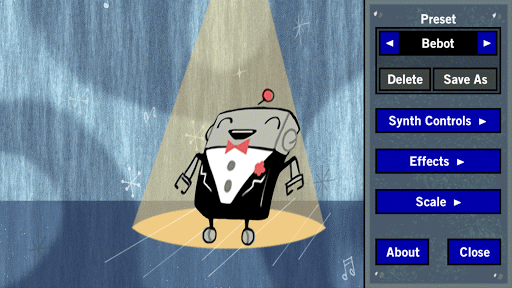 Bebot is a fun and unique musical instrument, with an easy control system designed for touchscreens, and a friendly animated cartoon robot who performs your music and sounds for you as you play.