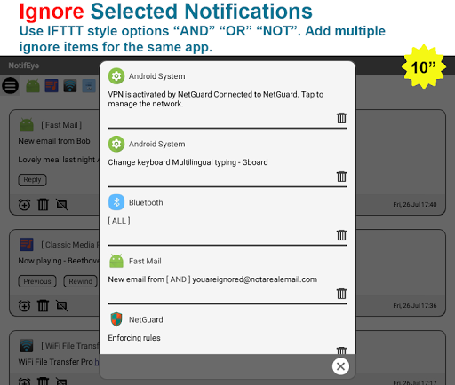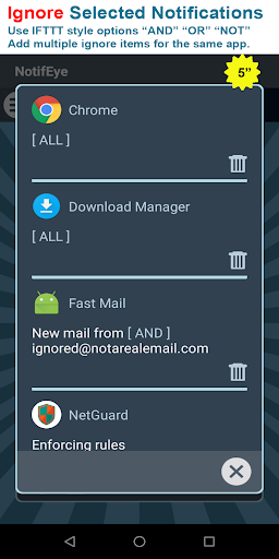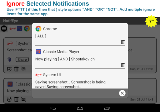 2. Put annoying notifications on a list that should be ignored in the future. Choose between all notifications from a selected app or individual notifications sent by that app, or create a custom ignore item based on text that you choose, you can use IFTTT ( If This Then That ) style options. *Please note you do NOT need IFTTT installed to use notifEye.