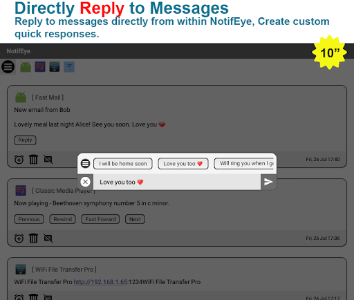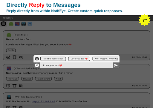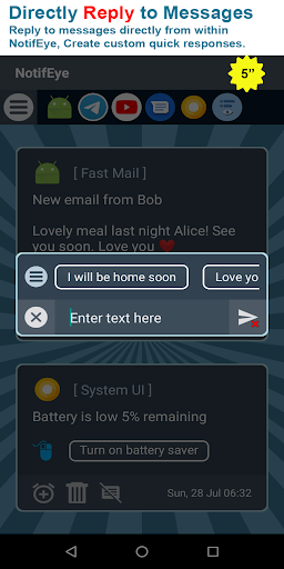 4. Directly reply to notifications from within notifEye. For example when you receive a text message you can view and reply to the message directly from notifEye without having to launch the messaging app. There are some built in quick reply options and you can create your own quick reply text.