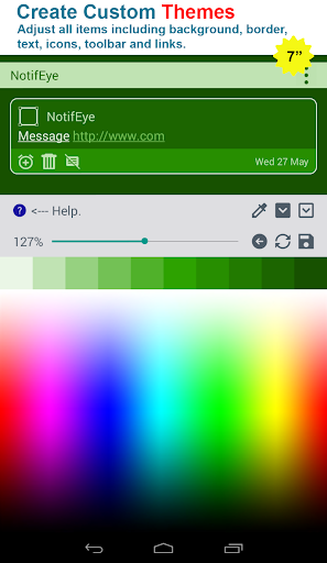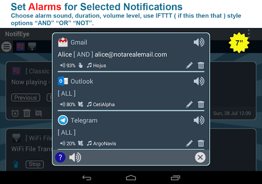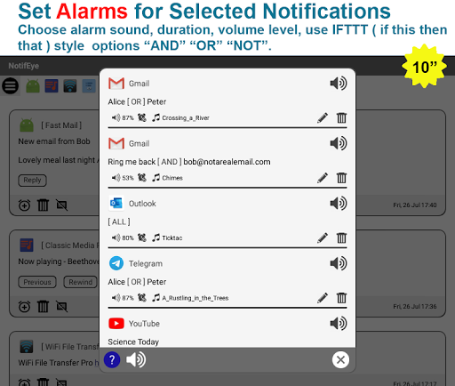 1. Create an alarm for any notification from any app that you have installed on your device. You can have an alarm of your choice with or without vibration, individual volume level and alarm duration. Choose between all notifications from a selected app or individual notifications sent by that app, or create a custom alarm based on text that you choose, you can use IFTTT ( If This Then That ) style options. *Please note you do NOT need IFTTT installed to use notifEye.