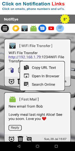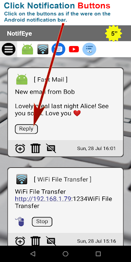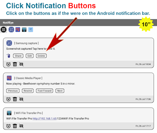 3. Click on notification buttons. When notifications are posted most have buttons that you can be press for example an email app might have an Archive and a Delete button associated with the notification, notifEye will display those buttons on its list so you can still use the buttons as if they were still on your status bar.