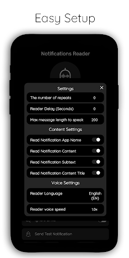 Notifications Reader has a large list of settings, you can choose whether you want to read the entire notification or, for example, only the title, reading speed, reading language, number of repeats, delay.