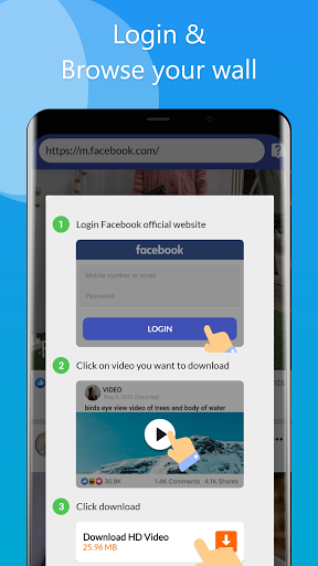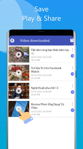 Video downloader for Facebook is designed to help you download videos from Facebook, it allows you to save them to your device and share your saved videos later from your gallery with your friends.