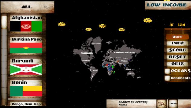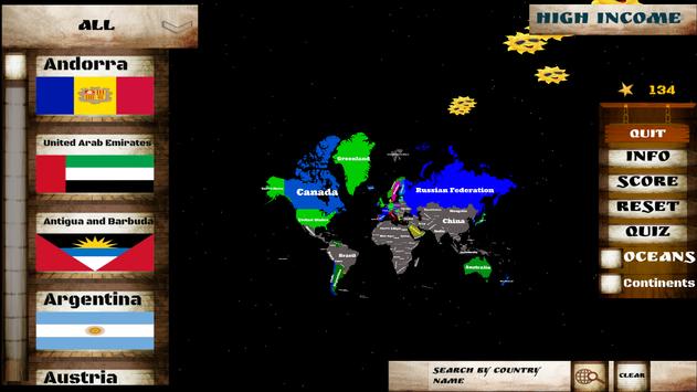 -Filter countries option on top of the screen to filter by High income, Upper middle income and Lower middle income, Low income countries and Quiz