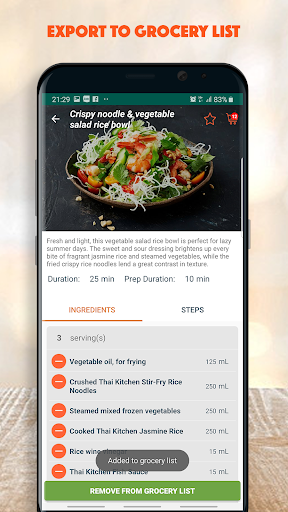 100 Thai Recipes Offline provides you more than 100 simple and delicious Thailand recipes varied from different categories such as appetizers, soup, meat, chicken, fish, vegetable and desserts. Within this application, cookers will be given step-by-step instructions as well as supported by shopping cart feature. We're sure that you will never miss any ingredients for your recipes.