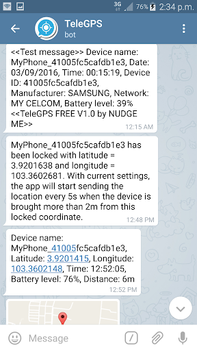 That's all. The bot will notify you through the Telegram messenger app when your device is moved outside the allowable range (refer the geofence perimeter value). The example usage of this app is to monitor your vehicle when you are on a meeting by leaving one of your mobile device equipped with this app in the vehicle. When the case the vehicle is stolen and leaving the locked location, you will be immediately notified through your Telegram app.