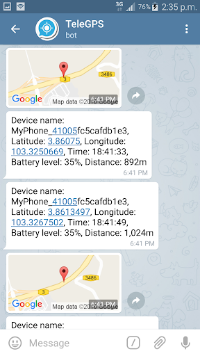 The bot will either send you the current location or current map or both to your Telegram messenger app in customizable interval such as every 10 seconds, 30 seconds or etc depending to the value in the Settings menu.