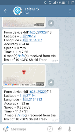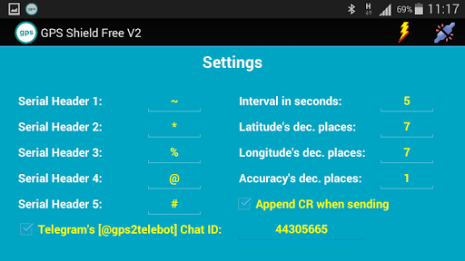 New: Send your locations to Telegram Messenger via maps and messages form! Open your Telegram Messenger app, search for "gps2telebot", select the bot and press START to activate the bot. Send "myid" to the bot to request your Chat ID and when replied by the bot, copy the Chat ID. Open this app (GPS Shield Free V2), go to Settings menu and enter your Chat ID in the "Telegram's [@gps2telebot] Chat ID:" box. Start the GPS and you are ready to go! The app will send your location map and coordinates to your Telegram app at the interval that you set in the Settings menu. Please note that this feature is only an extra function of the app as you can still send the coordinates to the Arduino like before. Refer below instruction for that.