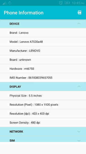 - Displays hardware and carrier information on a single screen