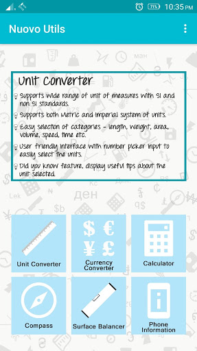 NuovoUtils is a single app with multiple tools. It is designed to ease your daily life with utility tools for unit conversion, currency conversion, calculator, surface balancer, compass and phone information.