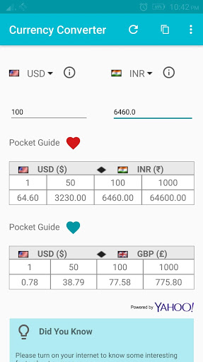 - Pocket Guides : save your favorite currency conversion values for easy reference. Save two currency conversions with frequently used denominations for your quick reference. Tap on the currency header to see reverse conversion values