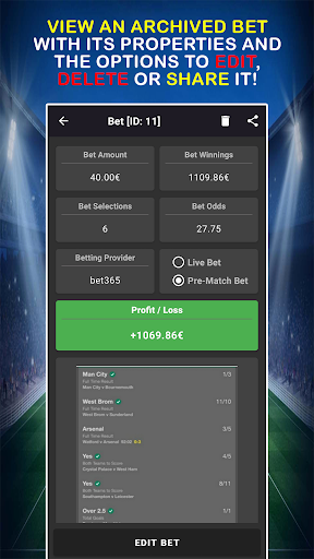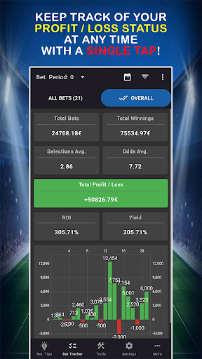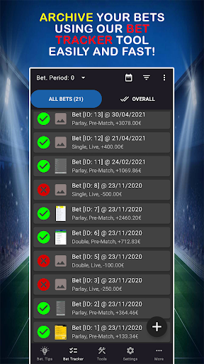 This is betFella's main tool. Control and better understand your betting activity by keeping all your bets in one place! Each time you place a bet, no matter the betting provider, you can use this tool to archive that bet along with all its properties and optionally, a photo of it. This way you can keep track of your Profit/Loss status ,along with other usefull information, at any time with a single tap! You can then filter your archived bet records based on their properties or the date they have been placed. Additionally you can delete, edit or share with your friends on social media a bet record. Finally you have the option to start a new betting period whenever you want or, start all fresh by removing all your bet records.