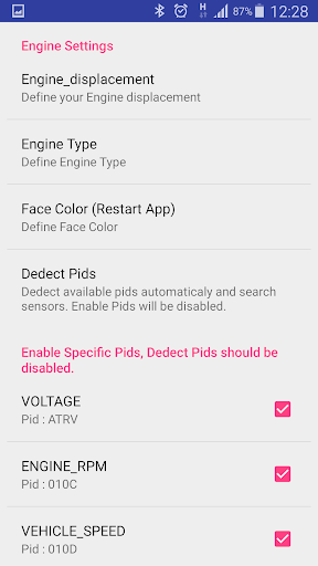App will detect available pids automatically and search for these sensors periodically. From preferences, user may select some specific pids or check getting pids automatically. More pids means less speed, less pids means more speed. If automatic pids selected by user, app will search available pids and get sensor info for these pids.
