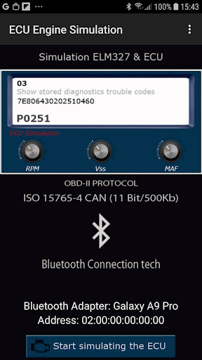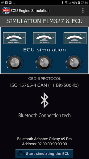On the starting screen there are 2 information about the simulation bluetooth OBD-II adapter