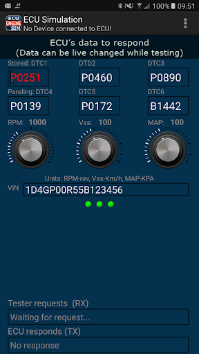 Use 2 android devices (they are bluetooth paired), the one runs this app (ECU) and the other runs an android OBDII app for testing