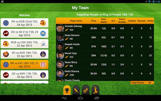 Easy drag n drop / click feature to set your Playing XI. Check the leaderboard after each match to see updated stats and your team's position in the league. Helpful push notifications to remind you to set your Playing XI, and to update you when the leaderboard is calculated.