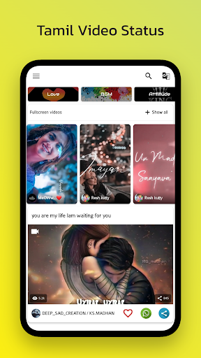 Tamil Status Video: love status Tamil allows you to quickly download any trending status video for FREE! You can save status video for WhatsApp, and share WhatsApp status video to friends & family.you can follow anyone and discover more new friends nearby and chat with them across India. You can also download and share your favorite video songs for WhatsApp, Instagram, and Twitter.