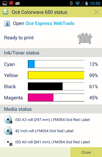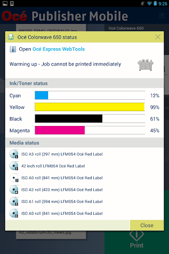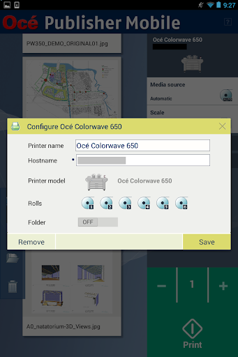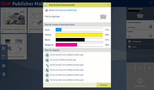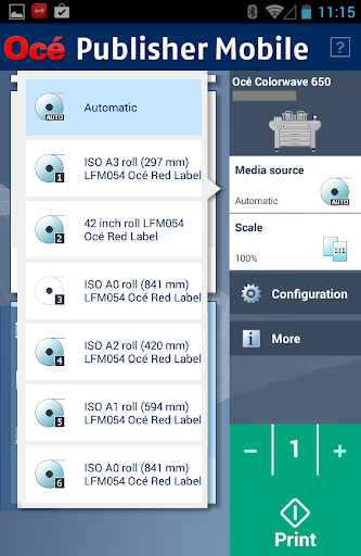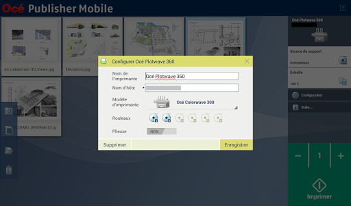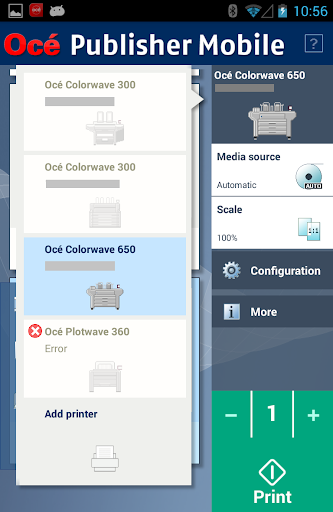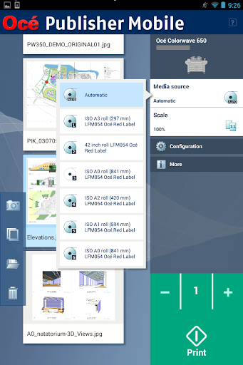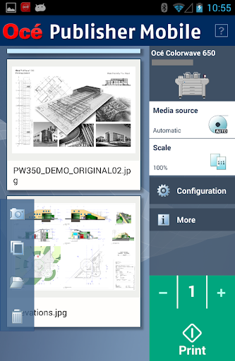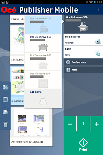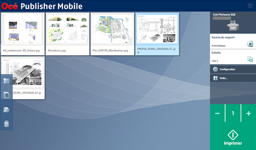 With Océ Publisher Mobile, you can print your PDF, DWF, PLT (HP-GL, HP-GL/2, HP RTL), JPG, and TIFF documents to Océ plotters. Reprint your documents, scale your plots, access the main settings, view the queue, media and ink/toner status of your plotter at any time. Available for all 10" Android tablets in 20 languages.