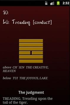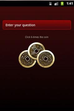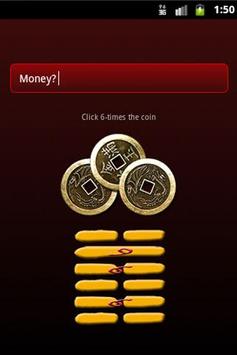 The app calculates the hexagrams according to the coin method. One have to press on the coin of the display 6 times and will generate six random numbers, that correspond the sum 2 2 2 6, 2 3 2 = 7, 2 3 3 = 8 and 3 3 3 = 9. This Hexagram will be shown on the display as well as the results. At the end you can also see the hexagram of the future, if in the calculation appear the numbers 6 and 9.