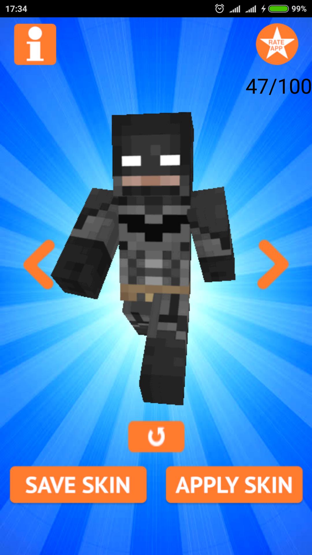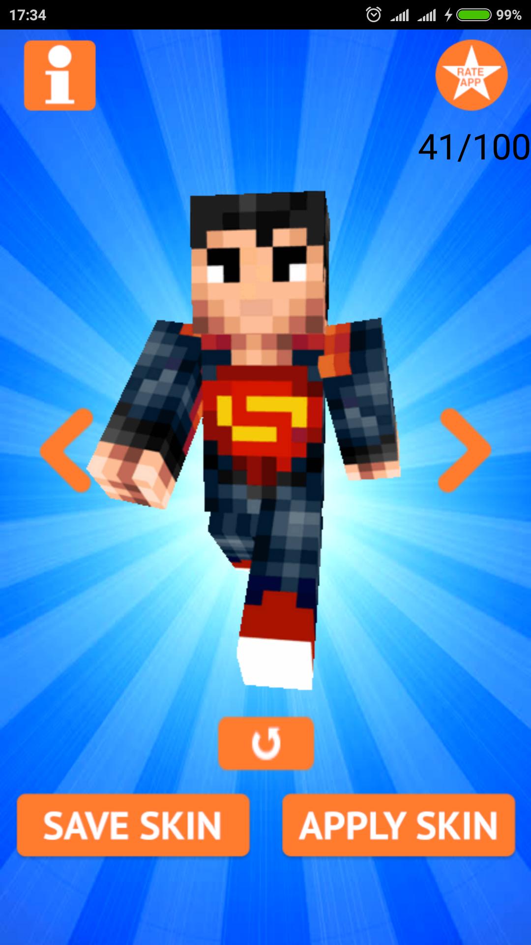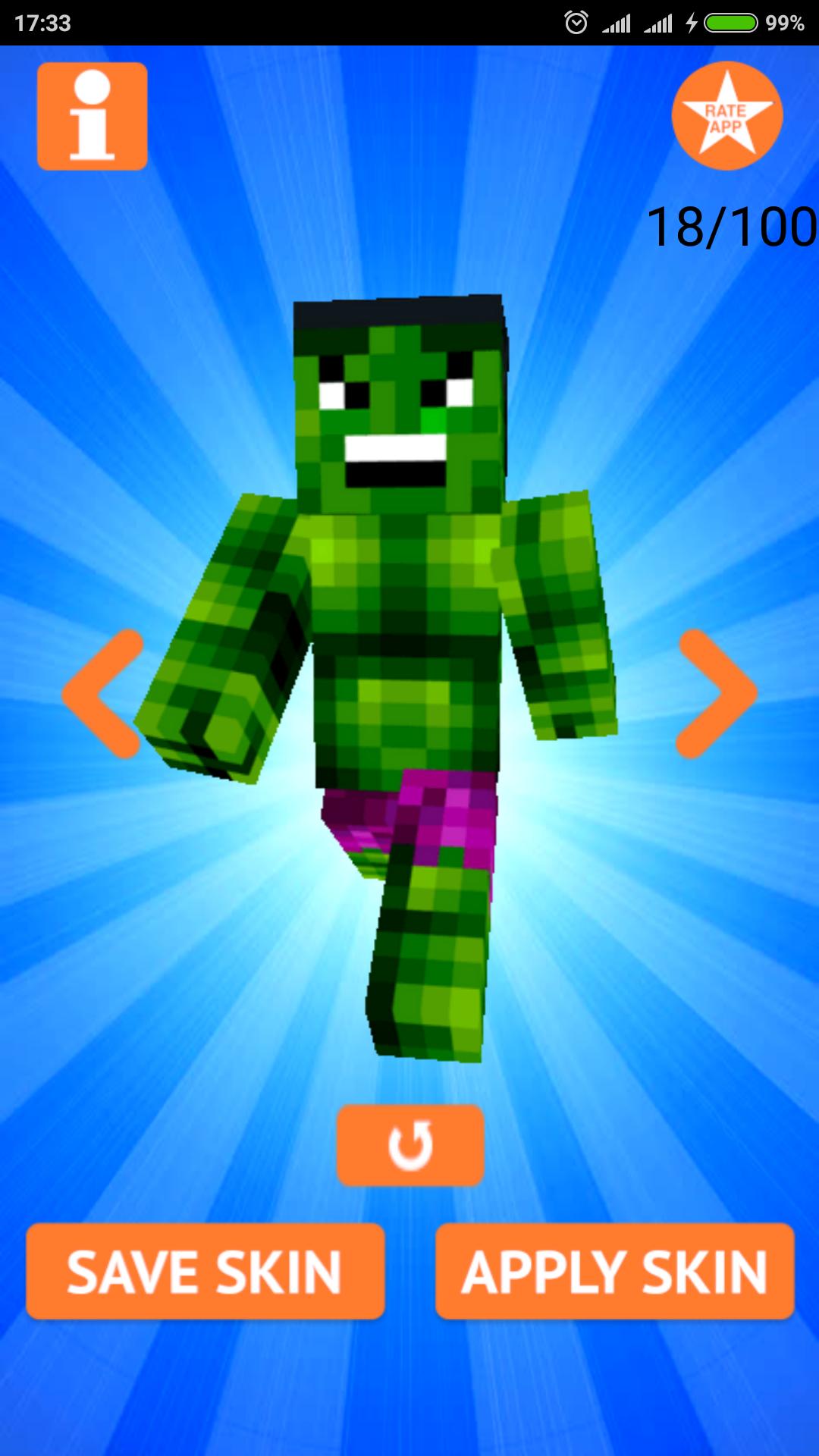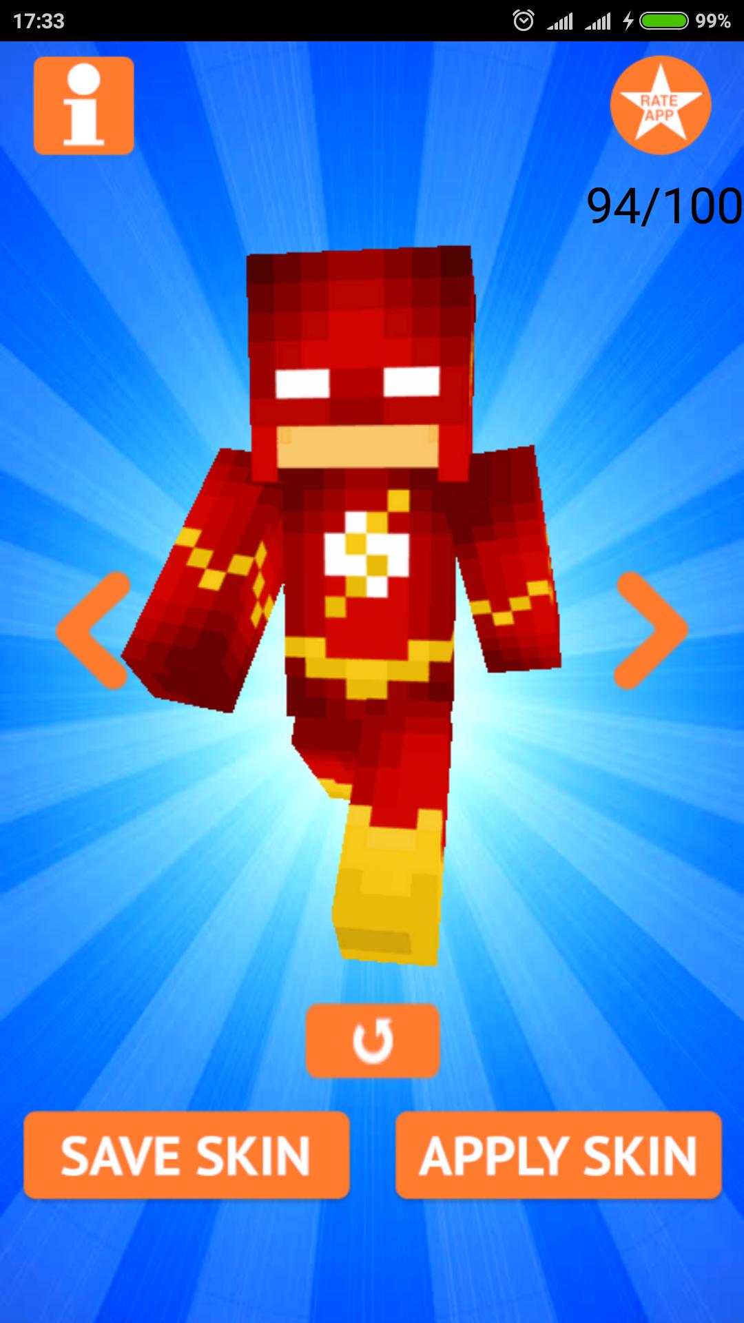 Super heroes are now also in Minecraft, try yourself as a savior of the world with super abilities. These are incredible skins of your favorite super heroes from movies and cartoons for Minecraft. You have collected all the most popular comic book heroes in one application, it's superman, spiderman, iron man, hulk, captain america, deadpool, batman, flash. All skins of superheroes of excellent quality, you can evaluate them from all sides and easily apply the skin you like in the game using our application. You can save the skins to your phone, and use them at any time.