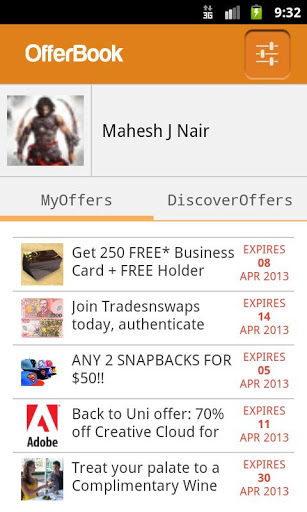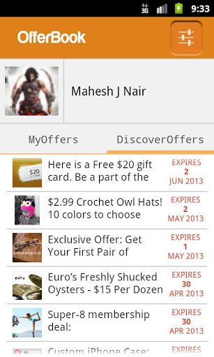 Consolidate, Discover, Claim and Redeem facebook offers..Introducing OfferBook, the smart and simple way to keep track of Facebook Offers from your Android device!OfferBook consolidate all of your facebook offers into one simple, elegant application for Android. OfferBook is designed to be fast and available within a few taps, just open the app, pick your offer and redeem… it's really that simple. Online coupons can be redeemed directly from within OfferBook! Our app even allows you to sort your online coupons by expiration date or recently claimed, giving you a birds eye view of your current and active online couponsFeatures: -100% free -Login using facebook-Consolidate all of your Facebook Offers - online and offline!-Redeem offline Facebook Offers in store-Redeem online Facebook Offers directly from the app -Sort offers based on expiry/claimdownload today and start enjoy great discounts and Facebook deals for free!find great deals online offers and discount coupons in a variety of categories, such as:Restaurant coupons, vacation deals, clothing coupons, electronics deals, sports deals, gift cards coupons, online shoping and more!