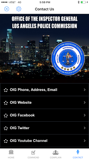 For additional information regarding the OIG Inspector General Los Angeles Mobile App, please contact: Officer Tony Newsom, Los Angeles Police Department at: 26986@Lapd.Online