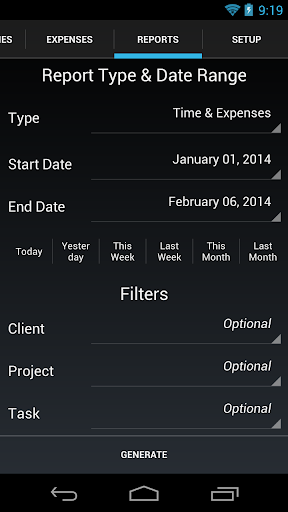 Adding new Clients, Projects, Tasks and Expenditures is super easy. You can create them on the fly without having to navigate to a separate maintenance screen. To edit them you can tap on Setup, do you edit and then return to where you left off in Time Entries or Expenses. By selecting a Project or Task first will automatically fill in the Client field for quick entry.