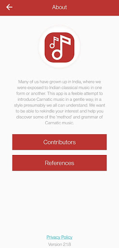 Many of us have grown up in India, where we were exposed to Indian classical music in one form or another. This app is a feeble attempt to introduce Carnatic music in a gentle way; in a style presumably we all can understand. We want to be able to rekindle your interest and help you discover some of the 'method' and grammar of Carnatic music. This app is obviously not meant for experts. We have intentionally kept this app simple. The idea is to introduce the richness of Carnatic music to get you familiar with one of the oldest systems of music in the world. So, let’s start by downloading this app!