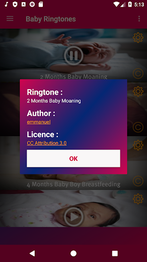 Sound clips used in Baby Sounds & Ringtones sound app are under public domain license and/or Creative Commons’ license. Sounds from this app are not commercial sounds from video games. App design and code copyright "Baby Sounds and Ringtone"