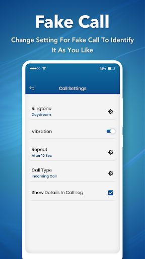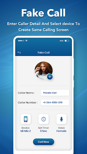 Fake Call is an application that simulates an incoming phone call with customizable caller name and number. Simulate a fake caller id to rescue yourself from an awkward situation, like boring meeting, annoying conversation, meaningless interview..etc