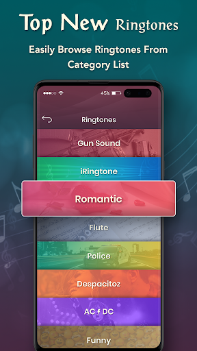There are many categories of ringtones like cool ringtones, ac dc ringtones, gun sound ringtones, romantic ringtones, flute ringtones, police ringtones, funny ringtones, sad ringtones, god ringtones and many more.