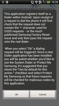 This is a simple application designed to protect against automated attempts to launch USSD requests, or the much publicised Samsung Factory Reset issue.